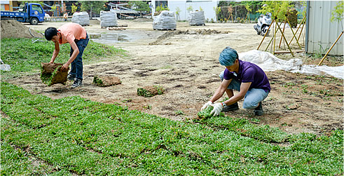 首先將地面雜草、石礫,所有雜物去除,接下來排水系統做確實,讓草皮在雨天積水時能快速的排水,保持乾爽潔淨,不讓草皮因為浸水過久而造成植株根部的損傷。